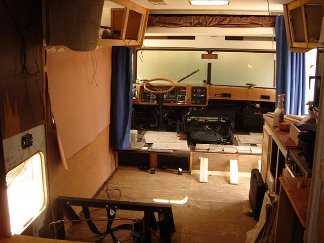 To the left is where our shower would soon be rebuilt.The shower had leaked in the past, and the whole floor had to be taken out. Also, the bathroom floor was mostly bad, so we tore that up as well, bye bye linoleum : ) For a little while, there was no bathroom floor at all, just a huge hole leading to the street. We used to get freaked out that somebody was going to crawl under the Winnie in the middle of the night and pop up at the foot of our bed like some zombie from Thriller. We put a couple scraps of wood over the hole and piled tools on top. "We need to rebuild that floor, soon."